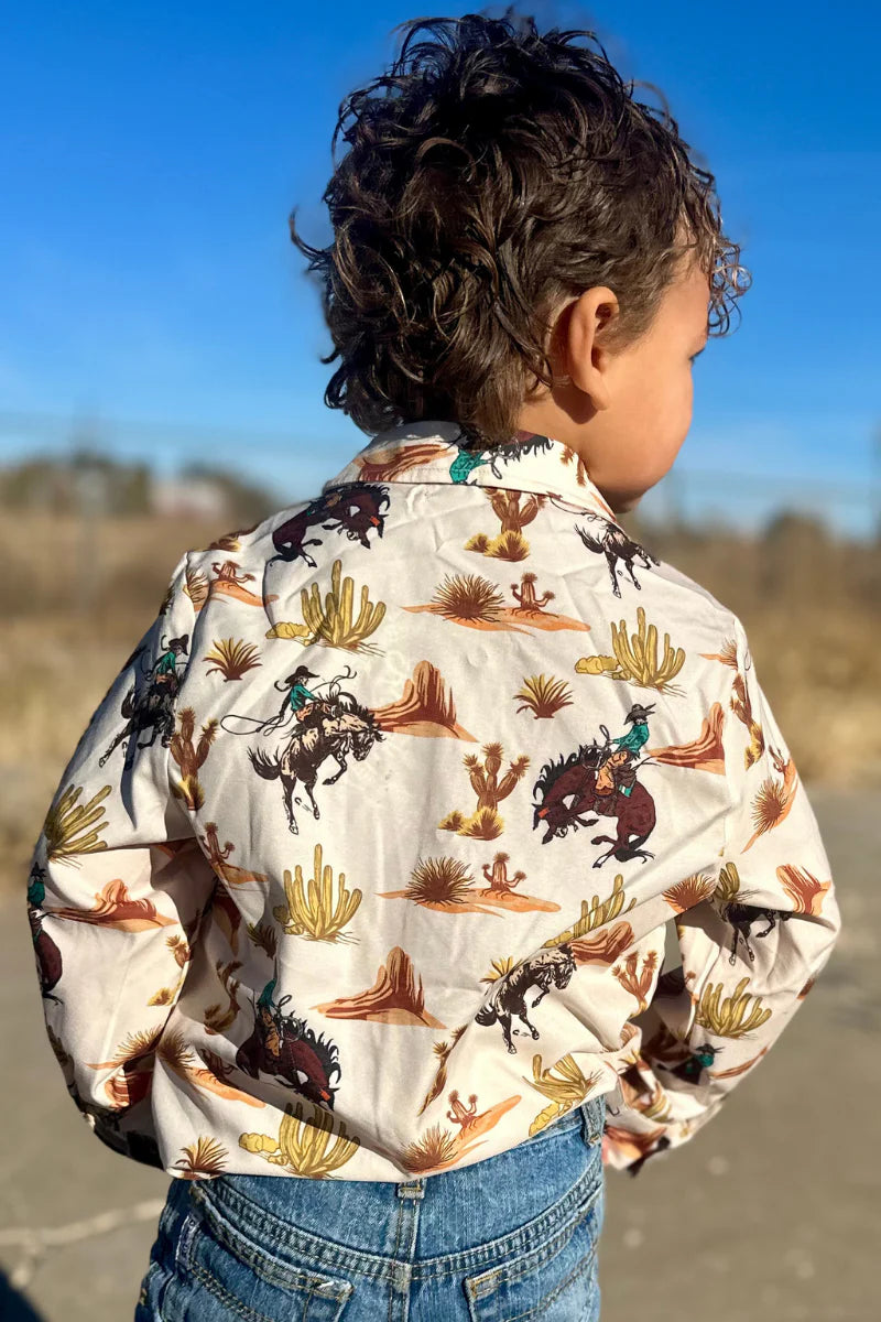 The Mini Down In The Desert Button Up is a playful kids' shirt featuring lively bronc horses and cactus prints. With a fun pop of turquoise, it adds a splash of color and western charm perfect for little cowboys and cowgirls ready to ride into adventure.